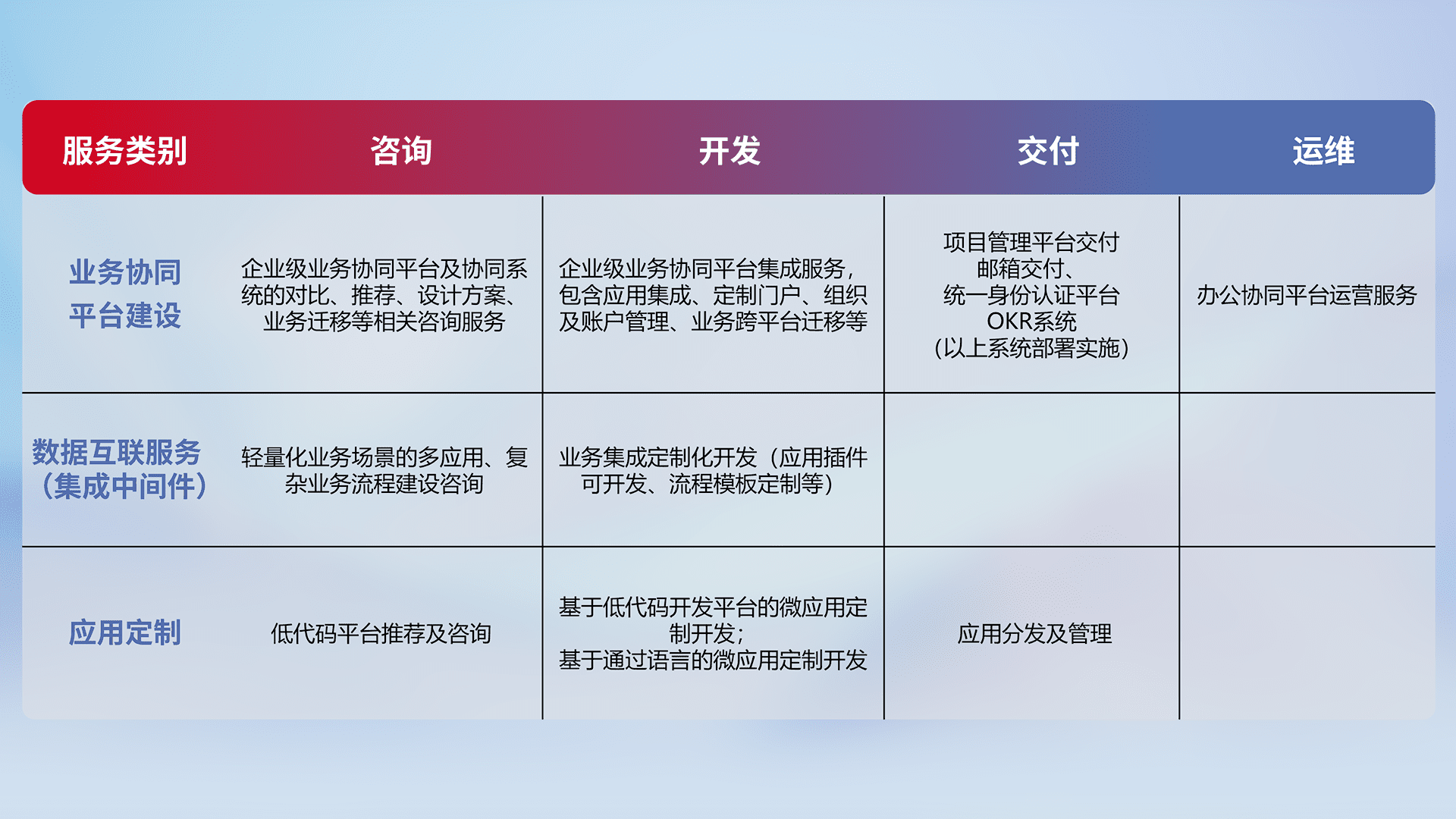 针对钉钉、、、、企微、、、IDaas等平台级产品提供产品的规划、、、、方案、、、、交付、、定制化开发等服务,,,,实现如统一协同办公、、、、智能客户服务、、、、混合会议管理、、、、智能数据查询、、等业务场景,,,,实现数字化转型。。。
